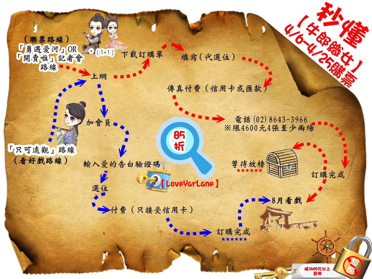 1. 於活動期間,購買粉絲預購聯票,聯票每組須購買4張4,600元85折票券(須含兩場以上場次),並付款完成者,即可擇一報名參加記者會或見面會。一組聯票可2名粉絲參加,2場共45組名額,數量有限,額滿截止。