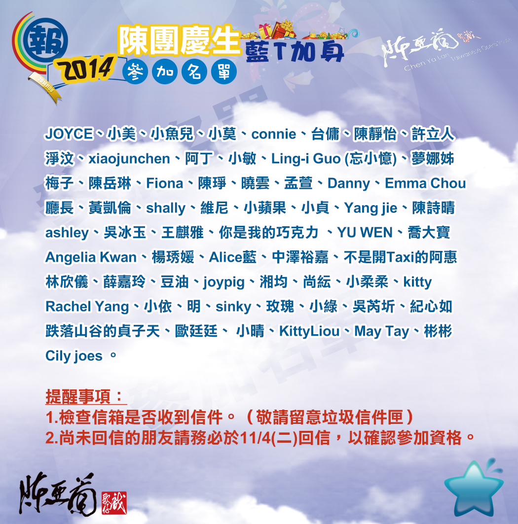 久等了,2014史上最萌小生陳亞蘭慶生會與會名單已經確認,